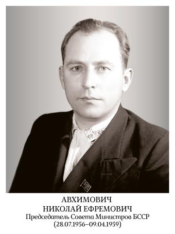 Авхимович Николай Ефремович (1.1.1907, г. Борисов – 12.9.1996), партийный и государственный деятель БССР. Окончил Коммунистический университет им. Ленина в Минске (1933), Высшую партийную школу при ЦК ВКП(б) (1948). В 1940–1947 секретарь ЦК КПБ. В годы Великой Отечественной войны на фронте; один из организаторов партизанского движения и патриотического подполья в Минской и Полесской областях. С 1948 1-й секретарь Гомельского, Гродненского обкомов КПБ, в 1953–1956 2-й секретарь ЦК КПБ. В 1956–1959 Председатель СМ БССР, с 1959 министр хлебопродуктов, в 1961–1973 – социального обеспечения БССР. Член ЦК КПБ в 1940–1973, ЦК КПСС в 1956–1961. Депутат Верховного Совета БССР в 1940–1974, Верховного Совета СССР в 1946–1962.
